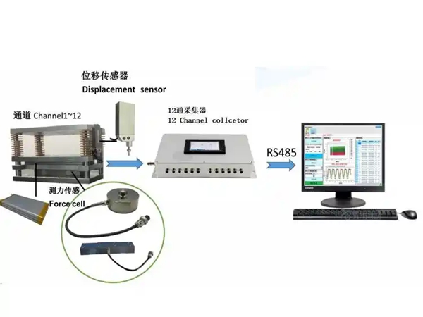 电池充放电设备通过上位机编写的工况对电池进行充放电,并能记录电流、电压、容量等数据;压力传感器能够检测到电池受到的挤压力变化,而得人精工这套电池膨胀力工装数据采集系统能够读取这些压力传感器的读数,从而记录电池表面压力的动态变化。