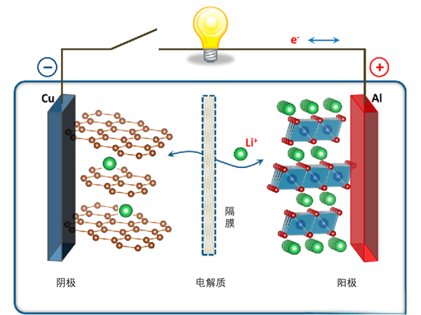 在充电过程中,由正极材料发生分解反应产生的锂离子在电场力的作用下扩散至负极,并嵌入负极材料中,反应过程如下所示:
